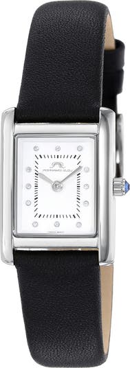 A leather strap watch features 12 diamond hour markers for chic style.