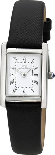 A satin-wrapped leather strap and blue stone–capped crown further the elegance of this tank watch featuring a classic Roman numeral dial.