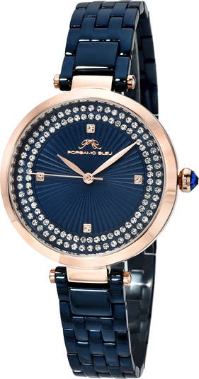 Two rows of crystals add sparkle and shine to a timeless bracelet watch featuring a textured guilloche dial with a sleek logo and crystal markers.