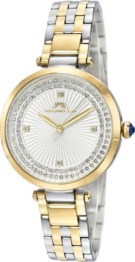 Two rows of crystals add sparkle and shine to a timeless bracelet watch featuring a textured guilloche dial with a sleek logo and crystal markers.