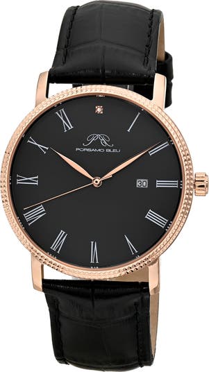 A single diamond at the 12 o' clock marker and gleaming roman numeral indices complete the elegant design of a three-hand watch secured by a croc-embossed leather strap.