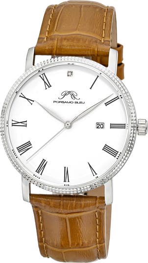 A single diamond at the 12 o' clock marker and gleaming roman numeral indices complete the elegant design of a three-hand watch secured by a croc-embossed leather strap.