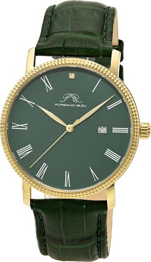A textured diamond-cut bezel and gleaming minimalist indices complete the elegant design of a three-hand watch secured by a croc-embossed leather strap.