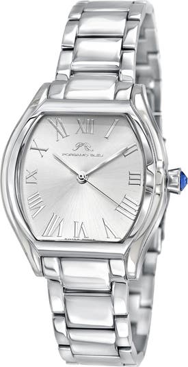 - 2 year Porsamo Bleu warranty - Gender: Women's - Dial Color: Silver - Strap Material: Stainless Steel - Case Material: Stainless Steel - Movement: Swiss quartz Ronda 763 - Crystal: Sapphire Coated Mineral - Closure: Foldover Buckle - Case Diameter: 33.5mm x 40mm - Case Thickness: 10mm - Battery - Water Resistance: 5 ATM - 50 m - 165 ft - Made in Switzerland