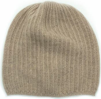 A timeless ribbed knit beanie offers a classic style into any look. - Rounded crown - Rib knit cashmere construction - Imported