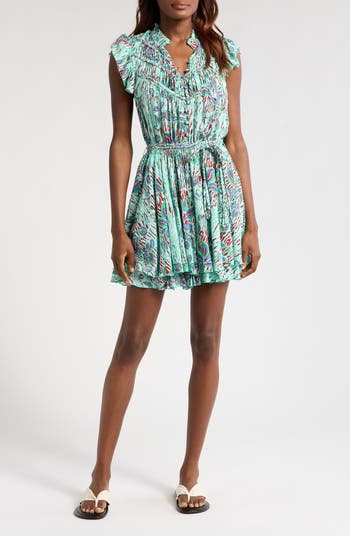 Braided details bring rustic texture to this lively printed cover-up designed with fluttering sleeves and a swingy skirt for fun, flouncy movement.