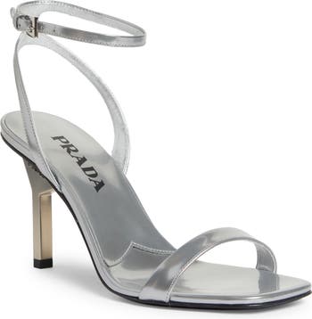 A sculptural heel with an iconic triangular Prada logo supports this minimalist ankle-strap sandal crafted of silvery calfskin leather.