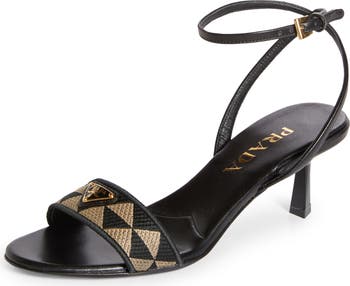 Prada's signature triangular logo is echoed in the jacquard motif of this square-toe slide sandal elevated on a chunky flared heel.