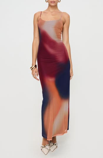 An artistic wash of color calls attention to a slinky dress in a sleek, figure-skimming silhouette with a low-scooped back.