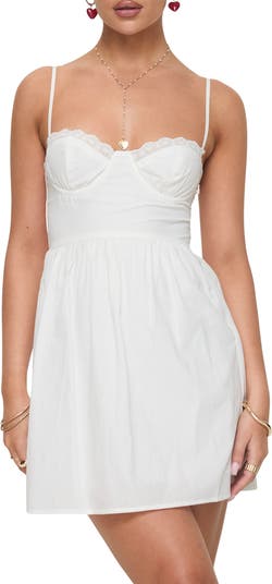 A corset-inspired bodice features lace-trimmed, underwire cups on this ultracute fit-and-flare minidress cut from crisp cotton poplin.