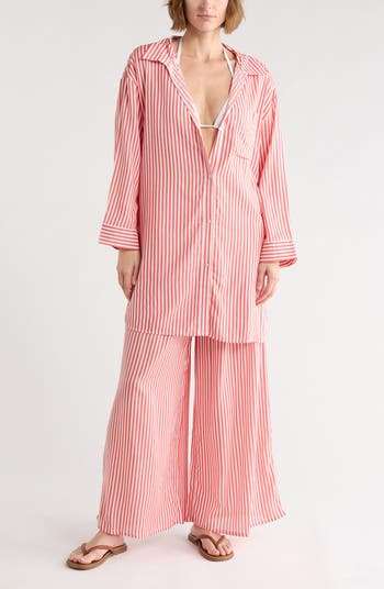 Beach to boardwalk days call for the comfort of a roomy cover-up tunic patterned in slim stripes for a classic look and feel.