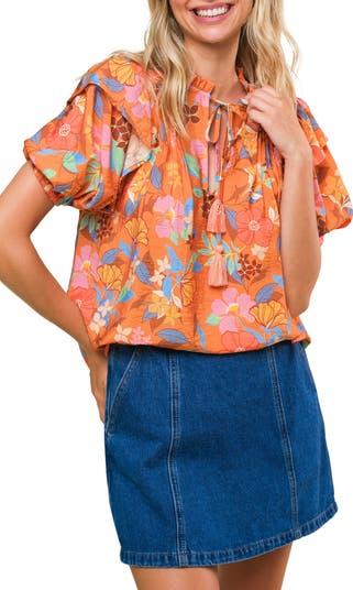 The printed top features a split neckline with adjustable ties and short layered puff sleeves for added dimension and interest.