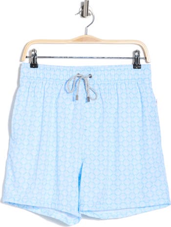 A medallion print tonally patterns a pair of swim shorts that are cut from lightweight, quick-dry fabric for surf-to-sand comfort.