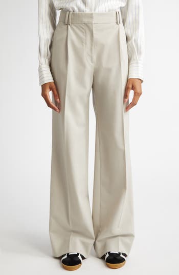 Crafted from virgin-wool-blend gabardine, these mid-rise pants boast a wide-leg silhouette with a relaxed, slouchy finish highlighted by pressed pleats at the front.