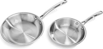 This professional pan set features 3-ply construction from rim to rim. Large stay-cool loop handles designed for easy maneuvering and control while wearing oven mitts. Flared rim for clean and dripless pouring. Compatible with gas induction ceran halogen and electric cooktops.