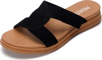 A contoured footbed and plush memory‑foam cushioning support every step in this slide sandal, furnished with an adjustable strap for a secure fit.