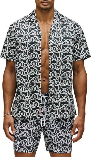 Cotton-stretch seersucker fabric keeps you cool in this vacation-ready shirt finessed with notch collar and an allover nautical-inspired print.