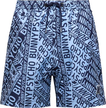 Covered in a repeating logo print, these kid-sized swim trunks made of quick-drying fabric will take them from land to water and back in sunny-day comfort.