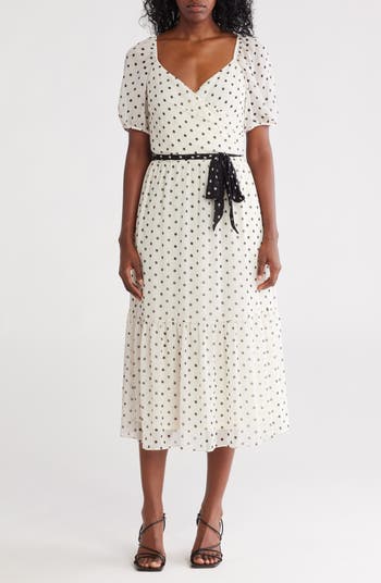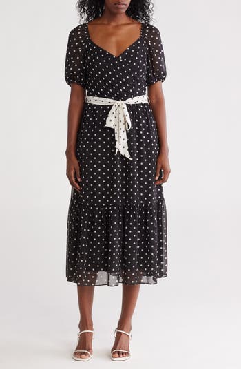 A tiered skirt brings playful flair to this charming midi dress, styled with a wrap-style bodice and finished with a contrast bow-tied waist belt for a sweet, standout look.