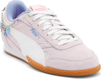Removable logo charms bring playful energy to this sporty sneaker that keeps your kid comfy with a padded collar, breathable mesh lining and a grippy sole.