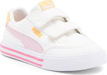 Twill canvas and a retro-cool vulcanized grip sole enhance this flexible sneaker, featuring hook-and-loop straps for easy, independent wear.