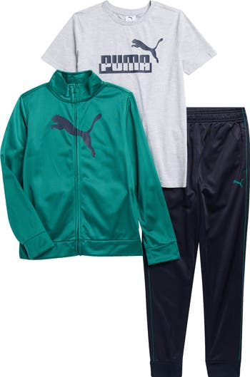 They'll score major style points with this three-piece outfit featuring a jersey graphic T-shirt, tricot track jacket and coordinating joggers.