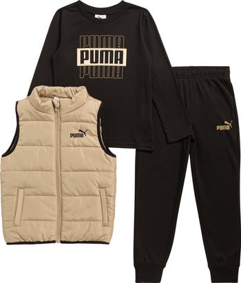 Give your kiddo sporty style with this logo-printed set including a long-sleeve T-shirt, cozy joggers and a lightweight puffer vest.