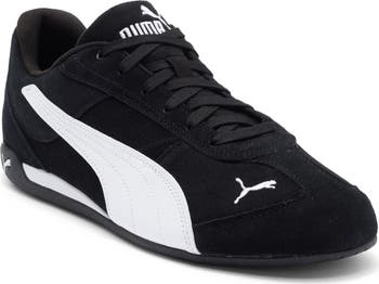 Buttery suede construction shapes a motorsport‑inspired silhouette in this low‑profile sneaker, finished with signature cat branding.