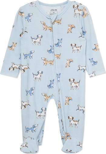 Soft and stretchy fabric ensures baby stays comfy and cozy in this footie covered in adorable puppy-themed graphics.