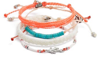 Bring subtle beachy vibes to any outfit with this bracelet set featuring beads and charms knotted to braided cording—all handmade by artisans in El Salvador.