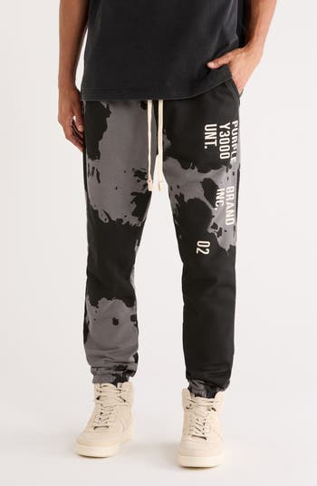 A vertical logo print adds streetwear-inspired authenticity to these cotton joggers covered in edgy bleach splatters.