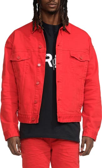 Shadowy palm trees cool a lava-red denim trucker jacket cut in a slouchy, oversized fit with a touch of stretch to help you go with the flow.