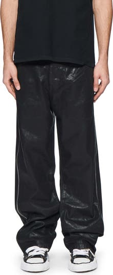 A 3D coating and glossy side zips amp up the edge style of these wide-leg jeans crafted from nonstretch denim.
