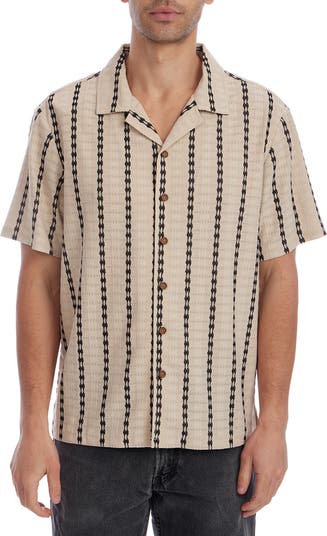This button-up camp shirt exudes easygoing charm with its relaxed silhouette and vertical chain-stitched pattern.