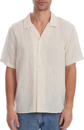 This button-up camp shirt exudes easygoing charm with its relaxed silhouette and crinkled slub fabric.