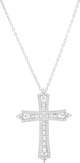 Baguette-cut and round cubic zirconia illuminate this Art Deco–inspired cross pendant necklace crafted from sterling silver or 14-karat gold plate.