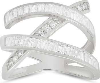 Baguette-cut and round cubic zirconia bring glamorous sparkle to this crisscrossing multiband ring boasting a high-shine finish.
