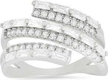 Round and baguette-cut cubic zirconia illuminate this dazzling spiral ring crafted from polished sterling silver or 14-karat gold plate.