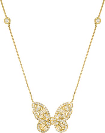 A cluster of assorted CZ stones illuminates the open wingspan of a sweet butterfly pendant necklace.