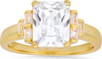 An emerald-cut cubic-zirconia centerpiece adds a touch of elegance to a stunning ring secured in a polished setting.