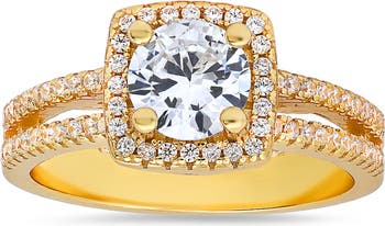 A glamorous round-cut cubic zirconia ring shimmers with a cushion-shaped cubic zirconia halo and pavé split-shank band.