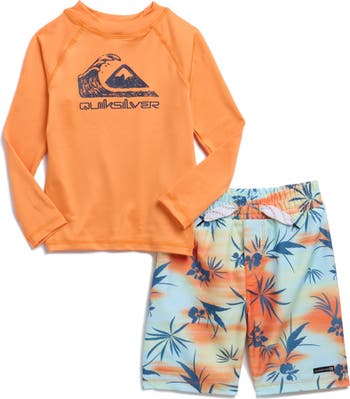 Your kiddo will be ready to conquer the surf and sand in a beach-day set that pairs a protective rashguard top with patterned swim trunks.