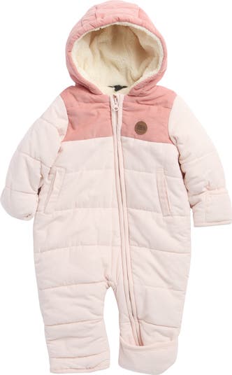 Your little one will stay cozy in this quilted corduroy snowsuit complete with a fluffy fleece-lined hood and boasting fold-over mitts and booties for added coverage.