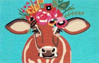 Bring a bright pop of rustic color to your doorstep with this delightful floral cow door mat, ideal for indoors and outdoors.