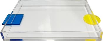 Geometric mixed color-pop handles add a touch of mod appeal to this acrylic tray that can serve as an organizer or storage tray.