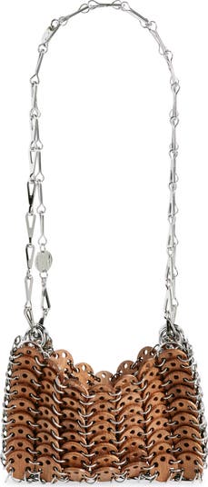 An iconic look since its introduction in 1969, this striking shoulder bag is updated with a first-time-ever mix of varnished-wood and metal ring-pierced discs.