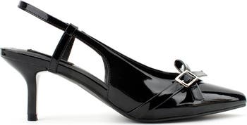 A buckled bow punctuates this glossy faux-leather slingback pump balancing a chic pointed toe with a slender heel.