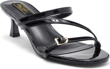 A dainty buckle brings a polished touch to this strappy slide sandal boosted by a modest heel for just-right lift.