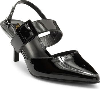 Show off chic style in this pointed-toe pump fashioned in a strappy silhouette and lifted by a slender heel.