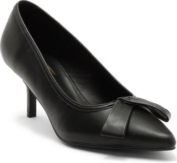 Show off polished style in this pointed-toe pump fashioned with a folded bow and lifted by a slender heel.